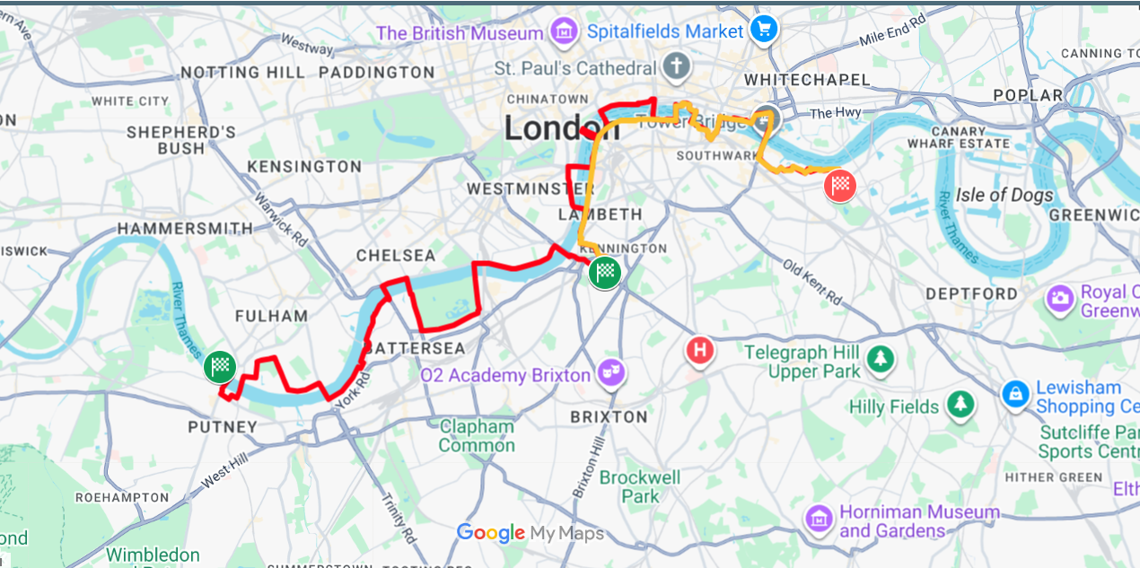 From a Putney Bridge start it’s East towards the City, zigzagging over 16 historic bridges, each with a fascinating story – and a mid-point rest stop at The Oval Cricket Ground for snacks & drinks. 25 km later, beyond the majestic Tower Bridge, it’s a party style finish line celebration & afternoon picnic in Southwark Park.