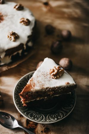 8. Once the cakes have cooled, sandwich together with two-thirds of the filling mixture. Spread the remainder over the top and arrange the walnut halves around the edge. A final flurry of coffee powder dusted on top will give it that extra special finish!