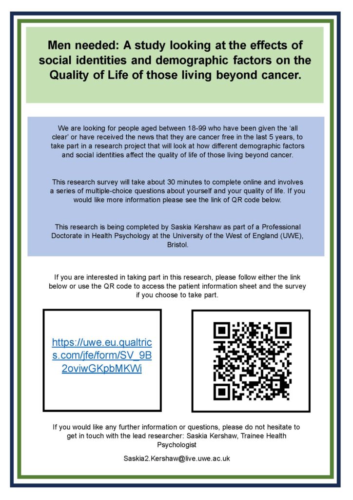 This research is being completed by Saskia Kershaw ([email protected]) as part of Professional Doctorate in Health Psychology at the University of the West of England (UWE), Bristol.